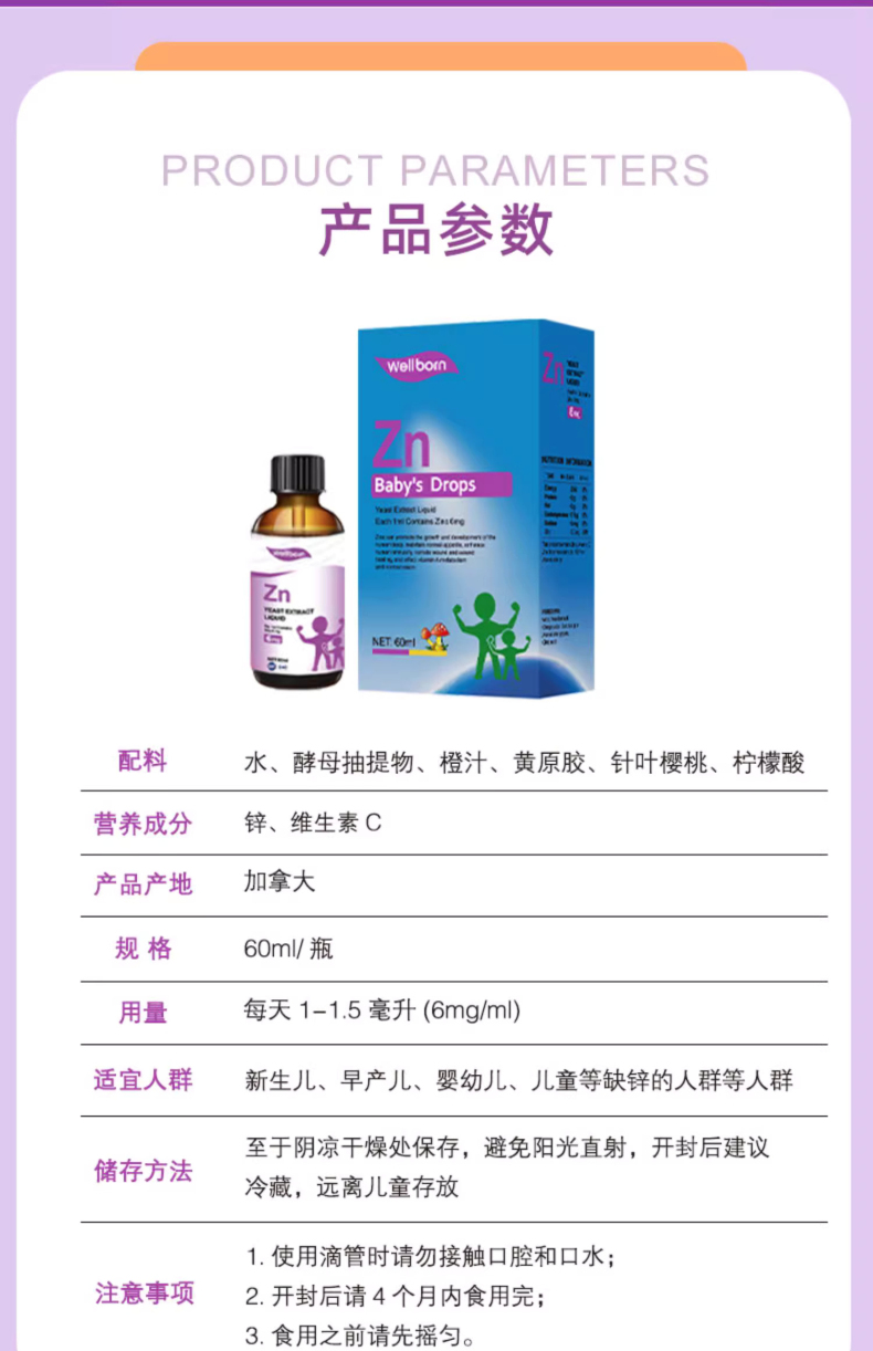 我们的锌产品,Wellborn威尔邦酵母抽提物饮品,专为婴幼儿童设计,采用加拿大进口的优质原料,每60ml瓶装提供充足的锌营养。